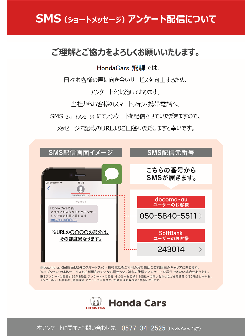 ホンダカーズ飛騨よりお客様の携帯電話へSMSショートメッセージにてアンケートを配信しております。