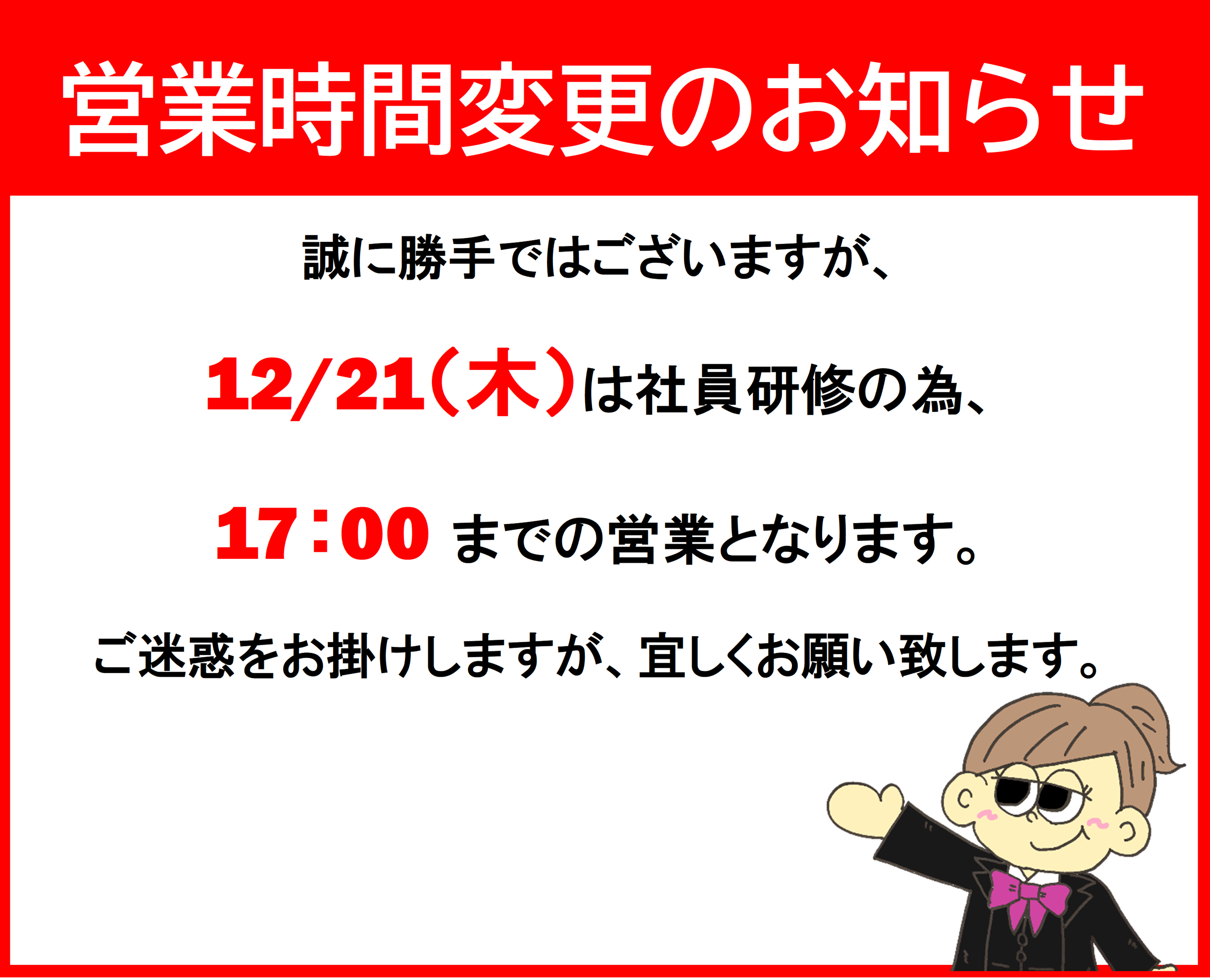 誠に勝手ながら、下記の通り営業時間を変更いたします。