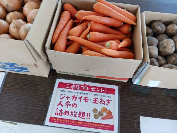 来店プレゼントとして、カレーや肉じゃがでお馴染みのお野菜(玉ねぎ・ジャガイモ・人参)の詰め放題をご用意しております。