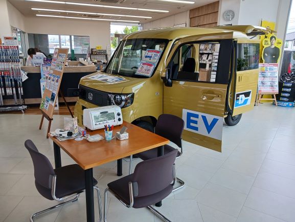 お子様イベントとしては、プラバンキーホルダーをお作りいただけます。トースターの電源を電気自動車から取るという当社ならではの企画です。