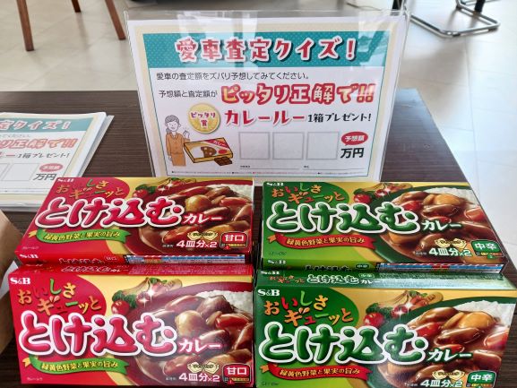 査定クイズで愛車の価格をピタリと当てたら、カレールーをプレゼント!お米を用意すれば夕食は決まりですね!