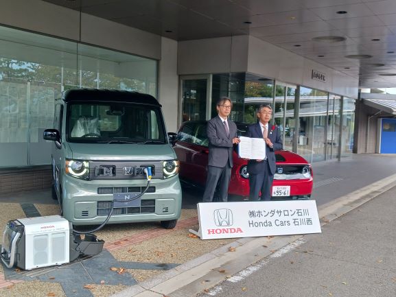 「災害時における電気自動車等による電力供給に関する協定書」を締結しました。大規模災害などが発生した際には、Honda Cars 石川西に配備されている電気自動車