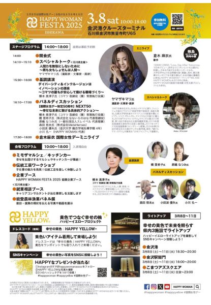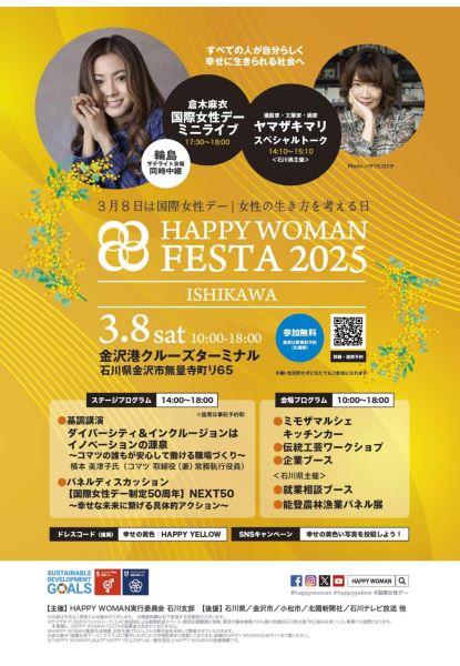 石川県は、国連が定めた「国際女性デー(3月8日)」にあわせて女性活躍の推進や男女共同参画社会の必要性を啓発し、さらなる女性活躍に向けた気運醸成を図るため、今年度新たに「共に創る未来フェスin石川」を開催するとのことで、また、同会場にてHAPPY WOMAN実行委員会主催で「HAPPY WOMAN FESTA 2025 ISHIKAWA」も開催されます。