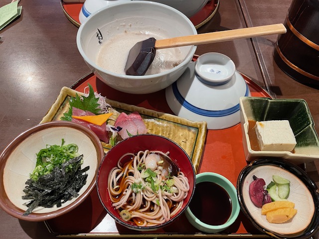 おひつ入りの麦飯の他に、香り物、お造り、自然薯豆腐、自然薯そば、