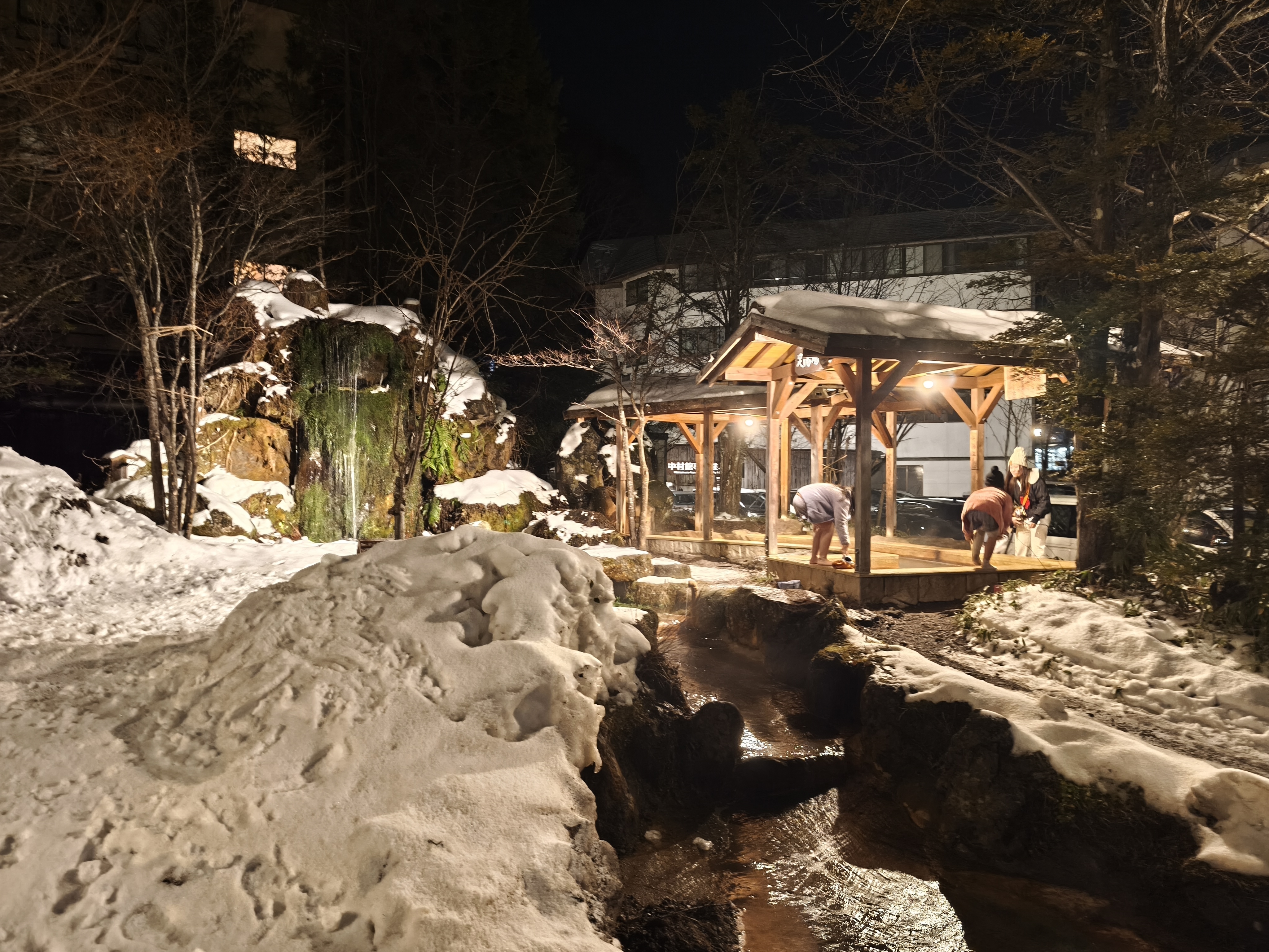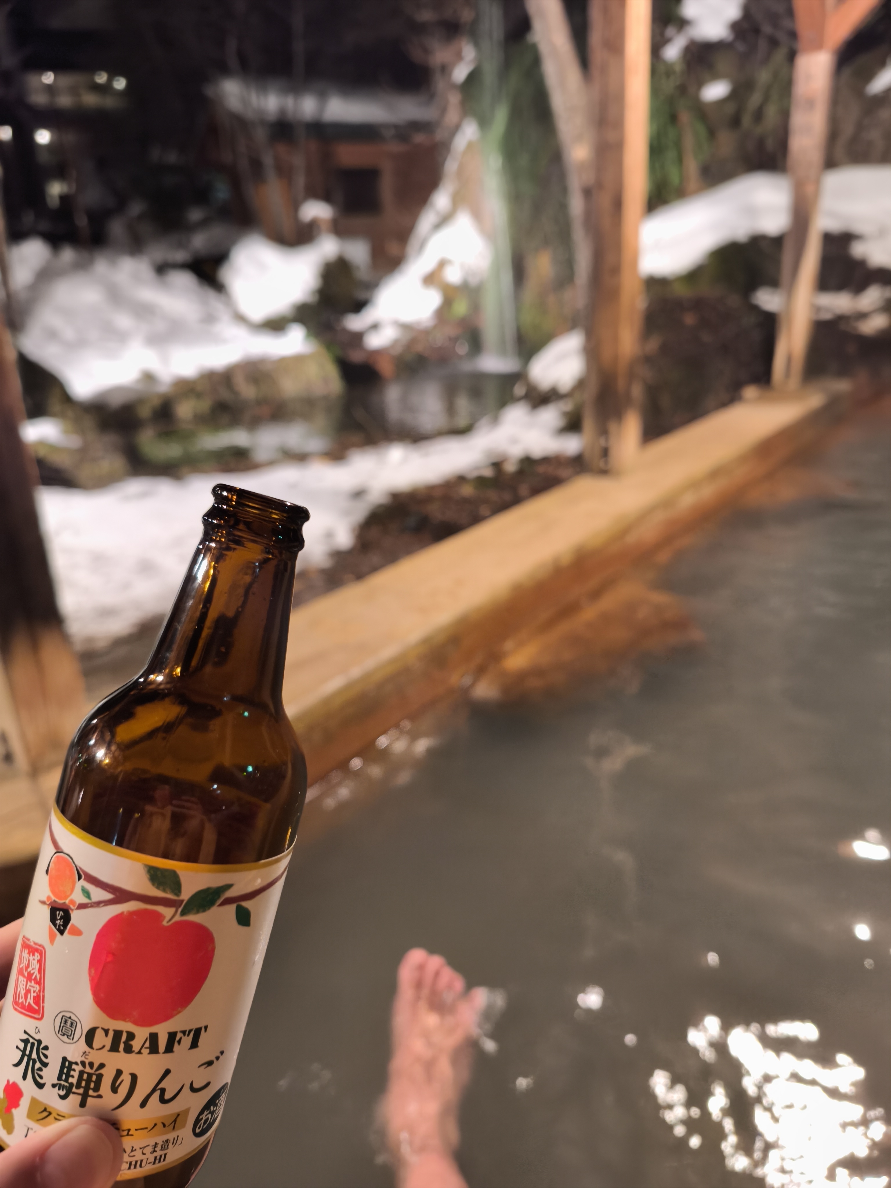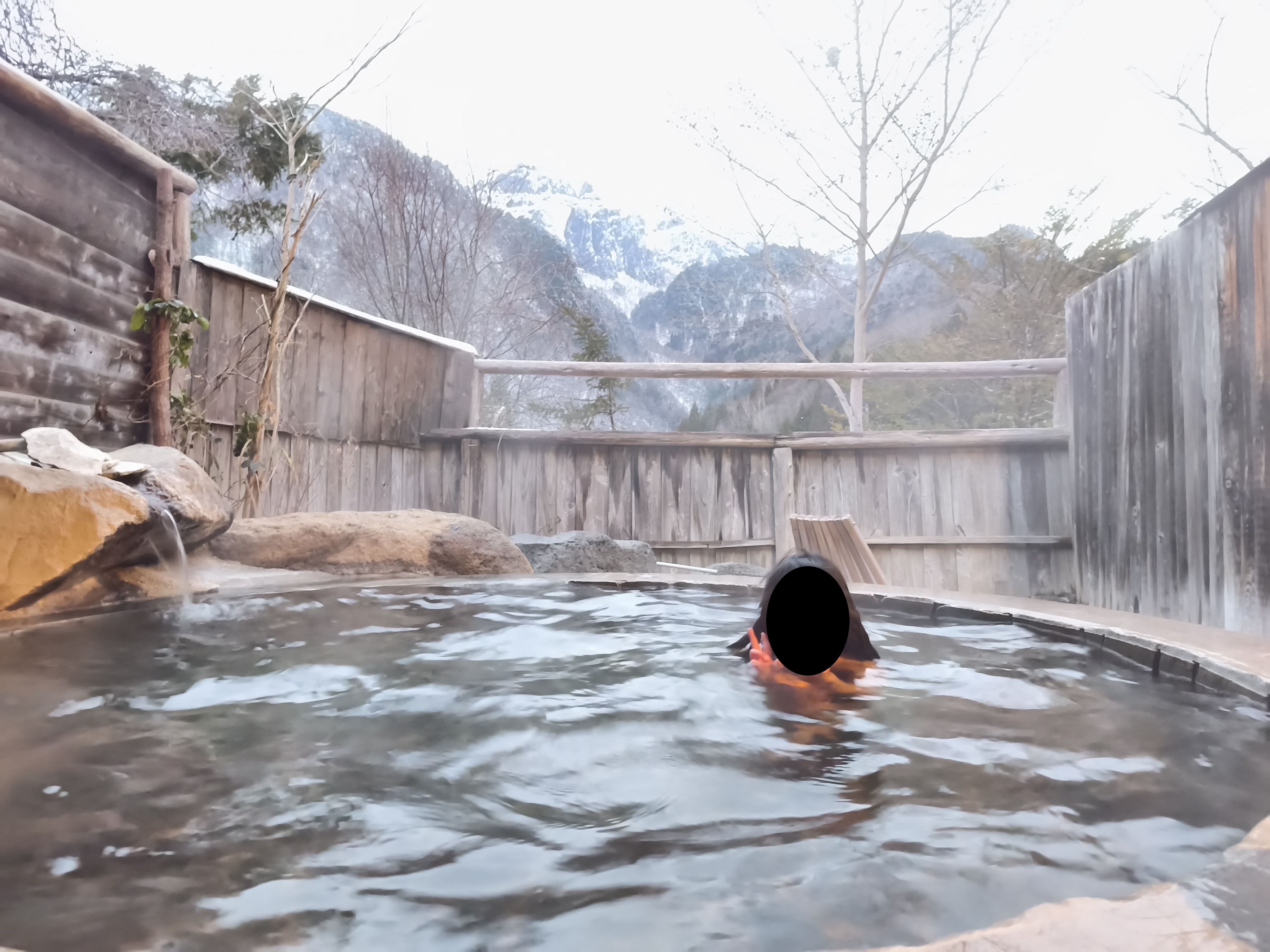 雪景色を見ながらの露天風呂は格別やで。