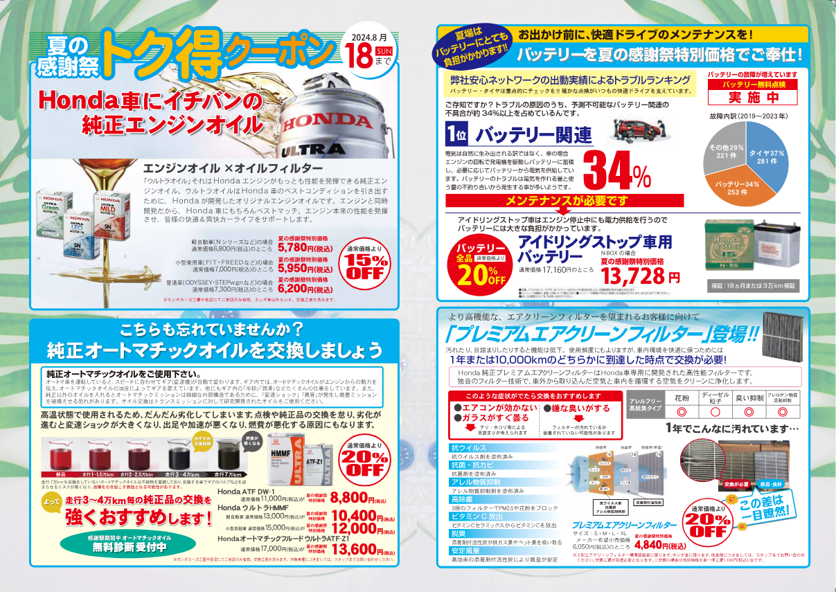 オイル類やバッテリーもお値打ち価格でご用意させて頂いております。