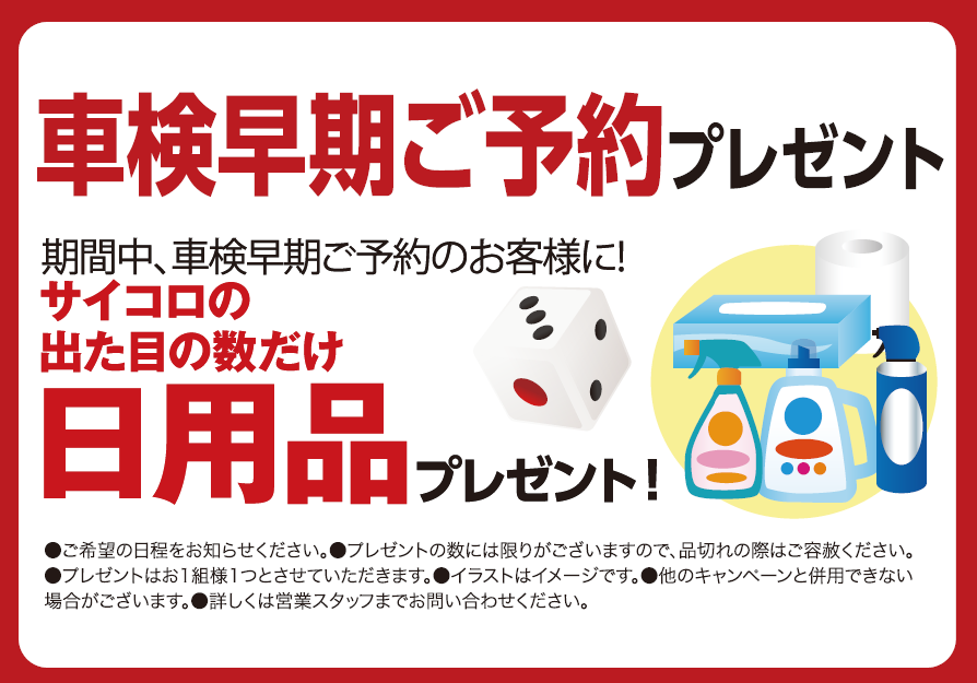 ★車検早期ご予約で日用品のプレゼントもあります♪