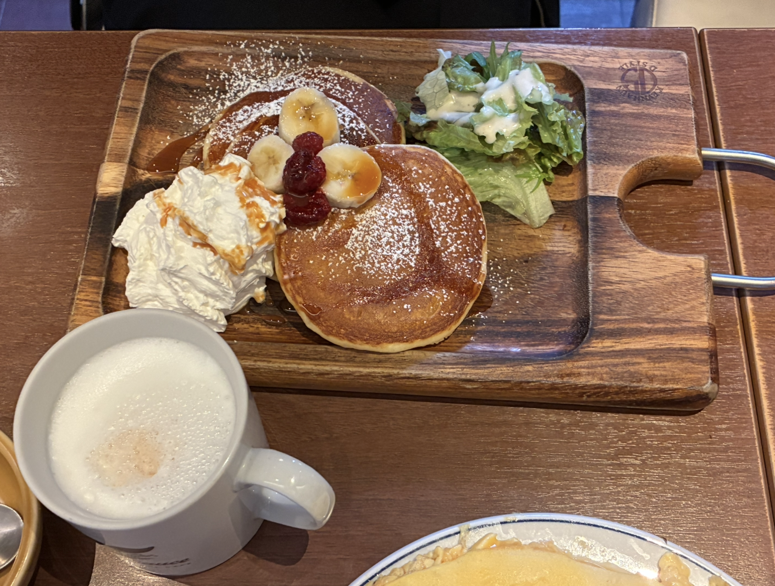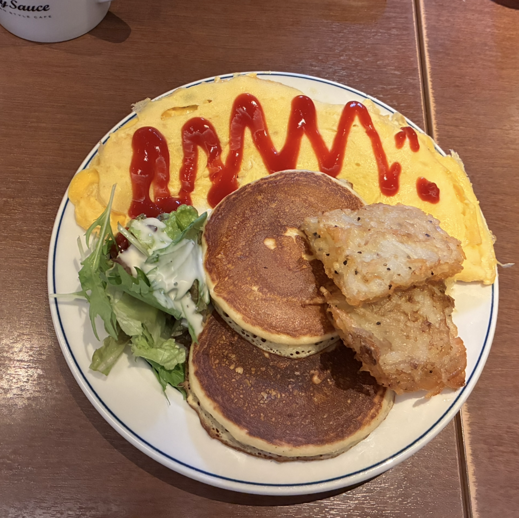 パンケーキに大きなオムレツがついているメニューを食べました!
