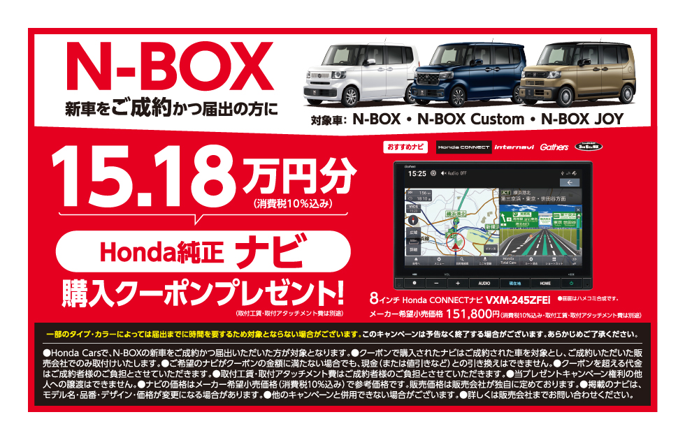 N-BOXシリーズご成約でナビ購入クーポンプレゼント