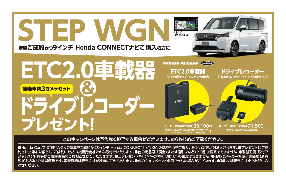ステップワゴンご成約かつ9インチナビご購入でETC2.0車載器&ドライブレコーダープレゼント