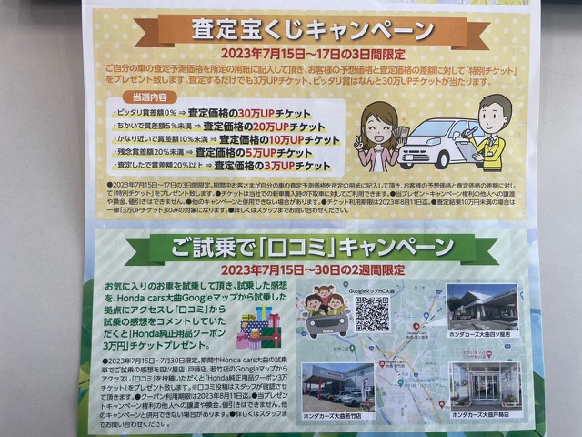 他にも査定宝くじキャンペーンやご試乗で口コミキャンペーンなど、ホンダカーズ大曲限定キャンペーンも開催します。