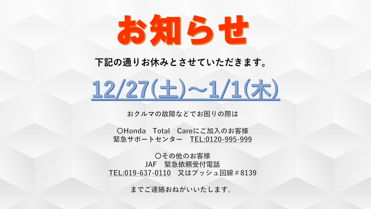 12/27(土)~1/1(木)まで休業いたします