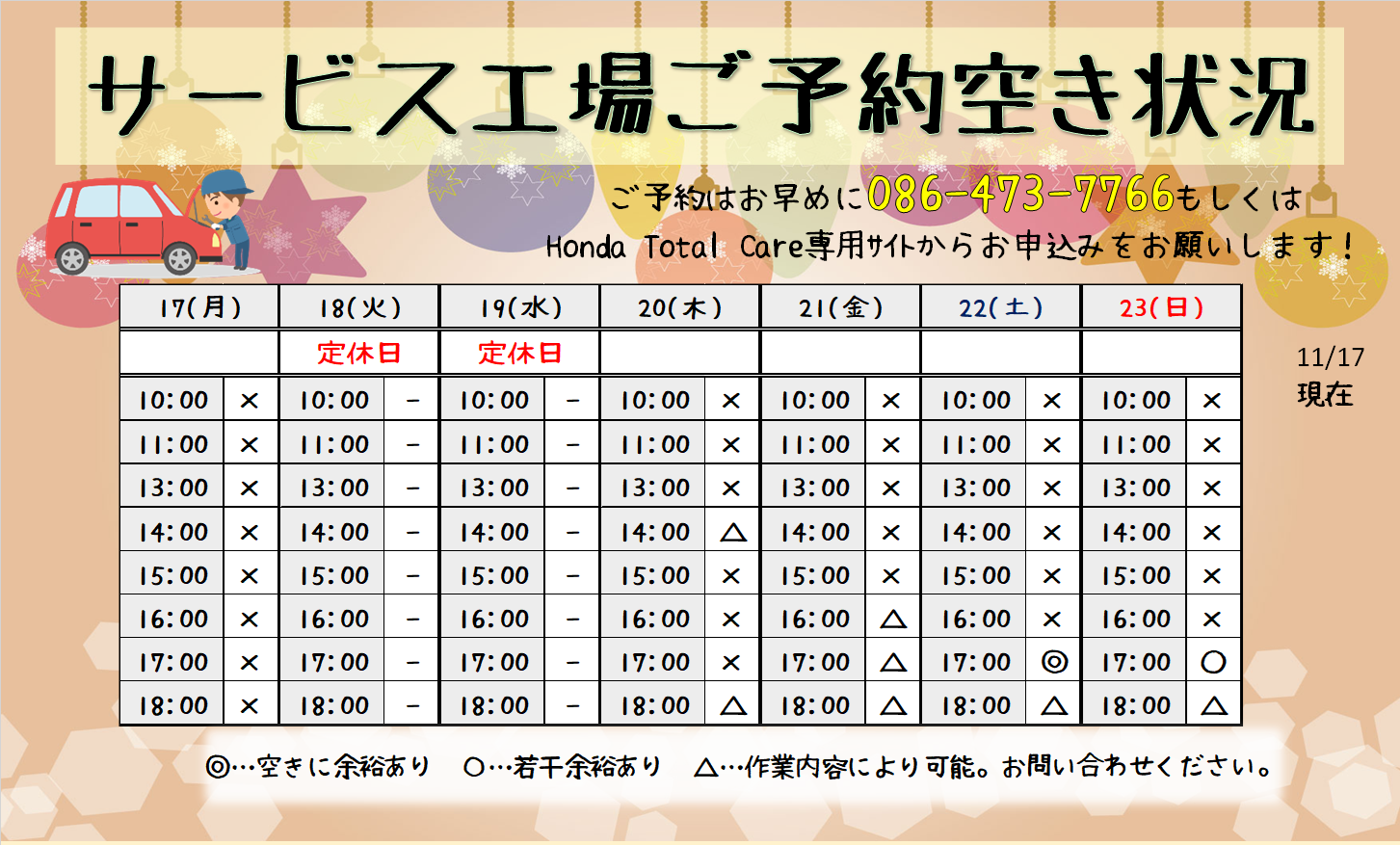 今週のサービスご予約状況お知らせです(`・ω・´)ゞ