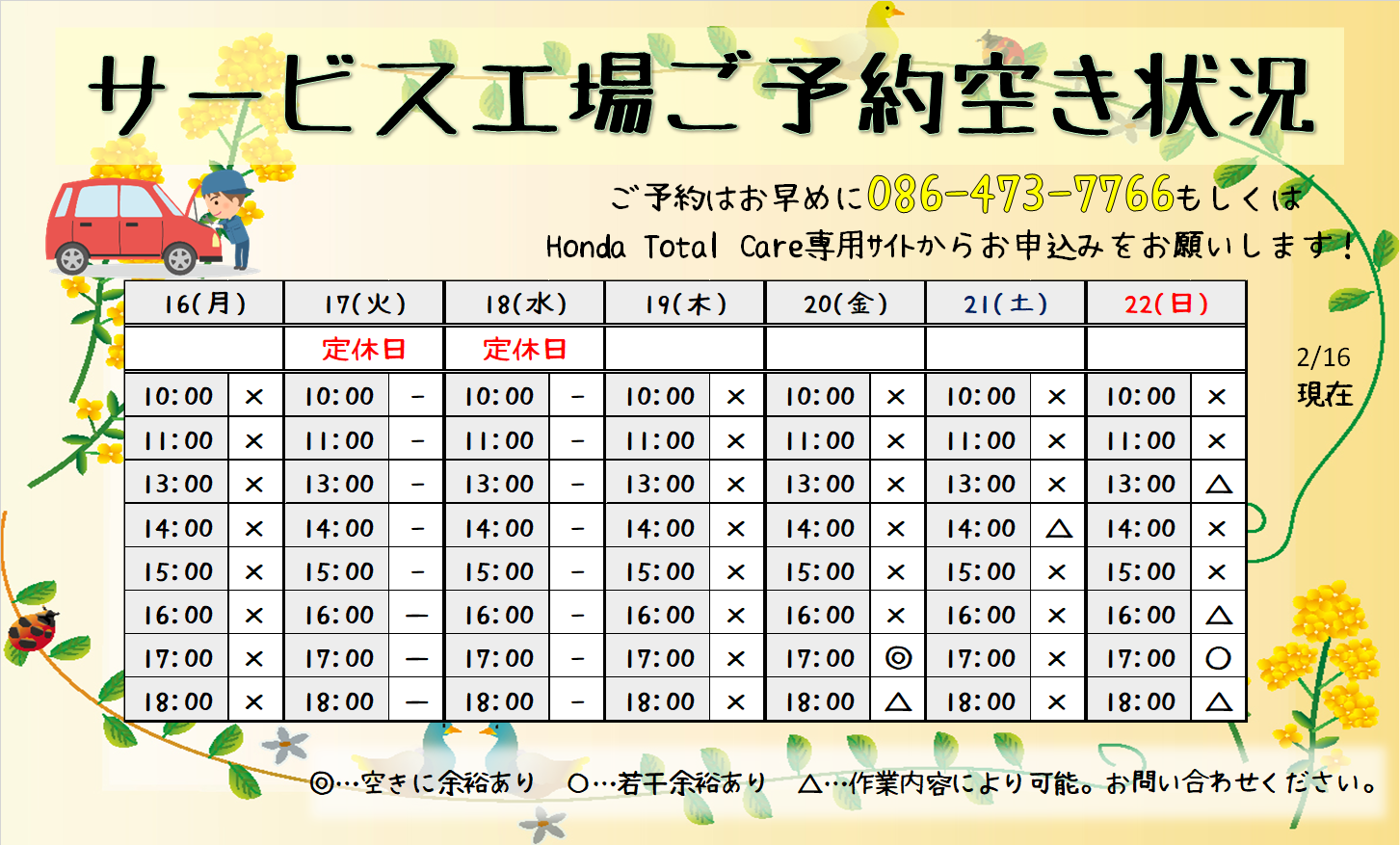 今週のサービスご予約状況お知らせです(`・ω・´)ゞ