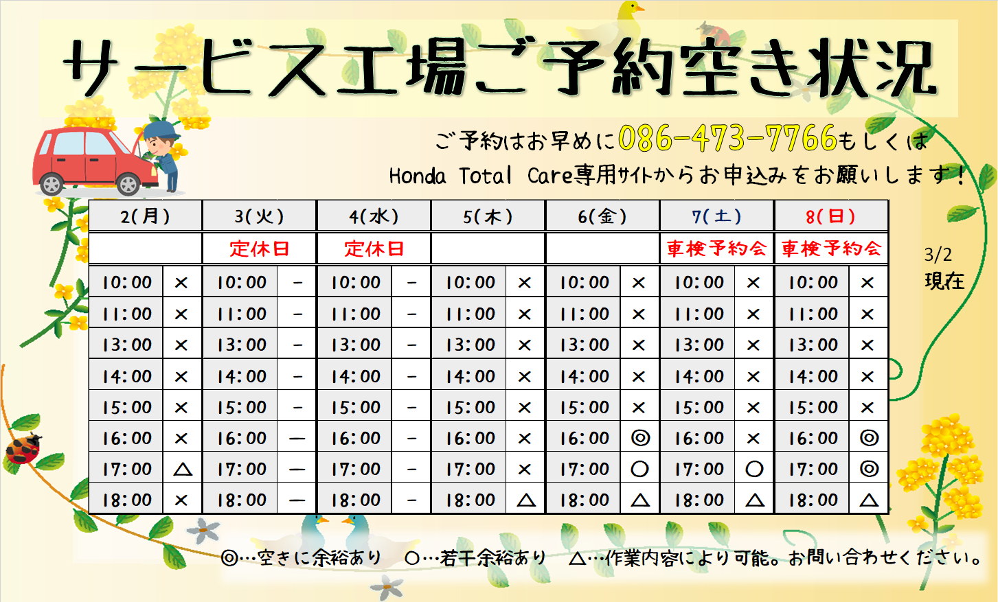今週のサービスご予約状況お知らせです(`・ω・´)ゞ