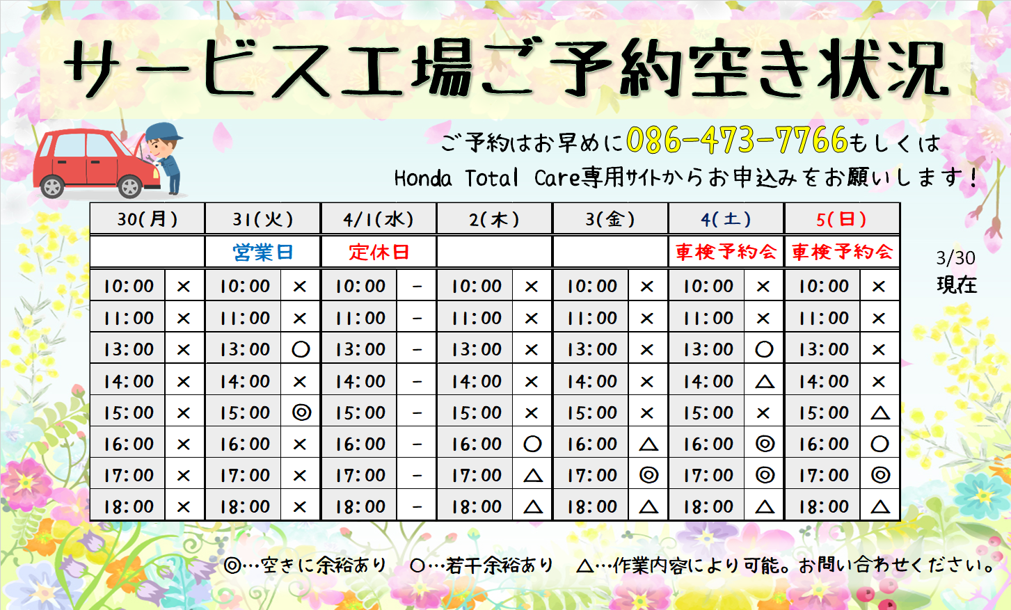 今週のサービスご予約状況お知らせです(`・ω・´)ゞ