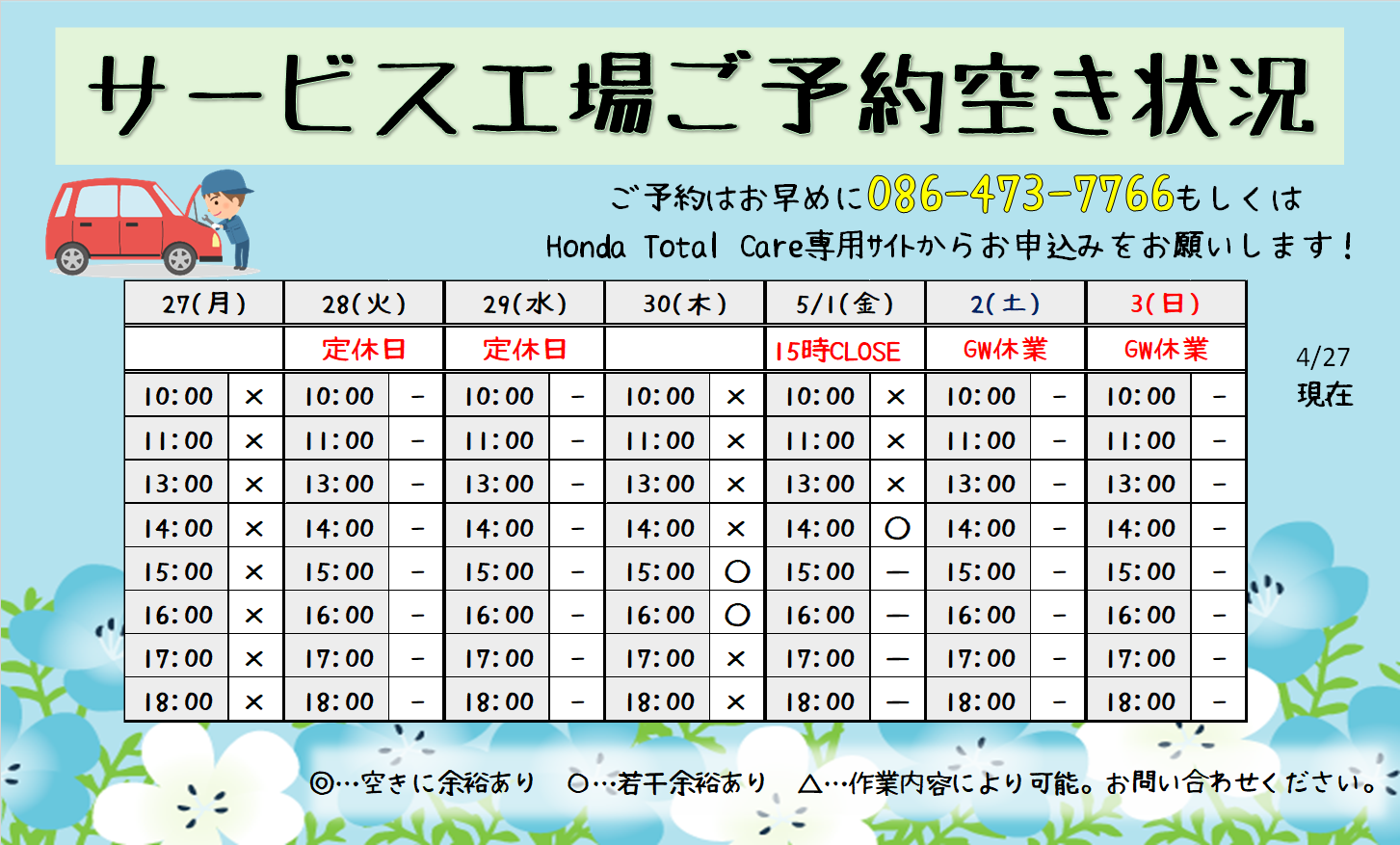 今週のサービスご予約状況お知らせです(`・ω・´)ゞ