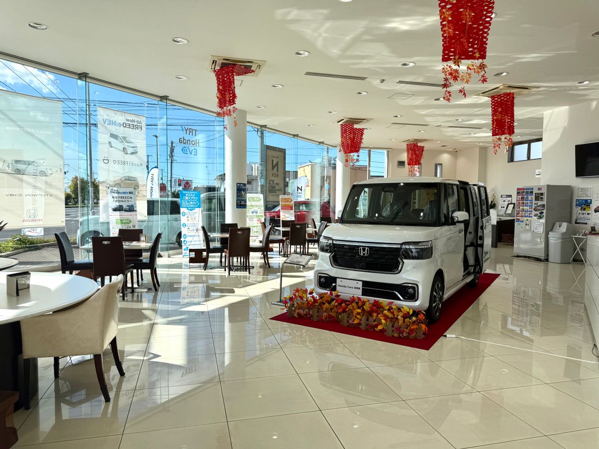 白基調の明るいショールーム、季節ごとの装飾が変わります◎