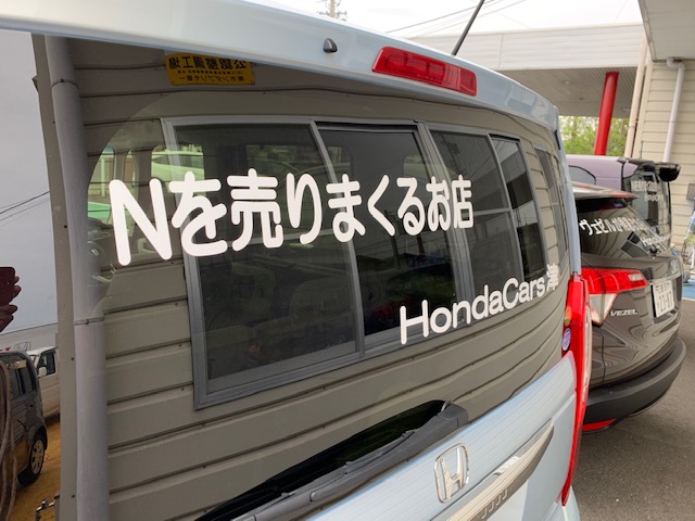リアウインドゥに宣伝の文言をカッティングシートで作成して貼りました @@