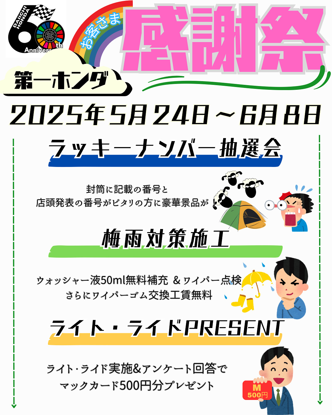 2025年5月24日(土)~6月8日(日)まで第一ホンダ お客さま感謝祭を開催いたします。