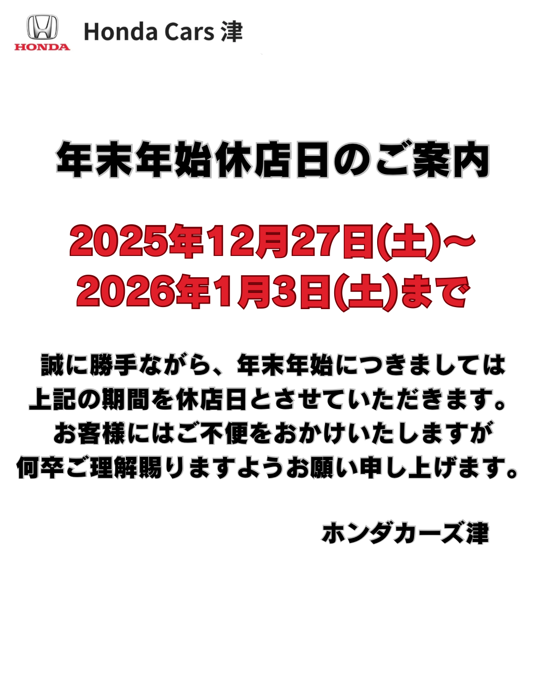 誠に勝手ながら、年末年始につきましては上記の期間を休店日とさせていただきます