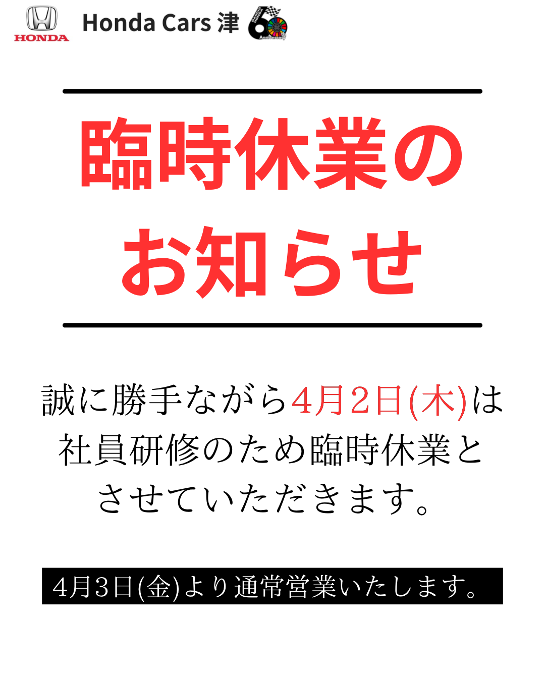 誠に勝手ながら2026年4月2日(木)は社員研修の為、臨時休業とさせていただきます。