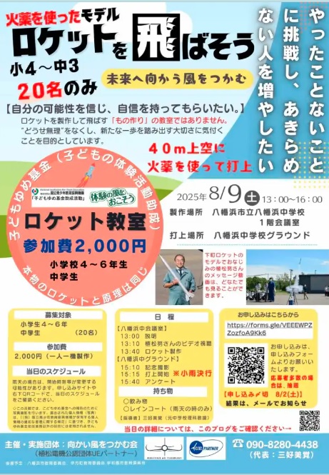 今回の「ロケット教室」の事業は8月9日(土)13時~16時に八幡浜中学校で開催されます。